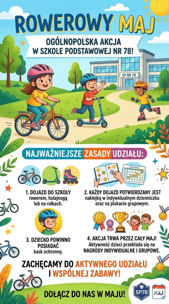 Pokażmy, że Szkoła Podstawowa nr 78 potrafi kręcić kilometry! Zachęcamy wszystkich uczniów do wspólnej zabawy i aktywnego rozpoczęcia każdego dnia.